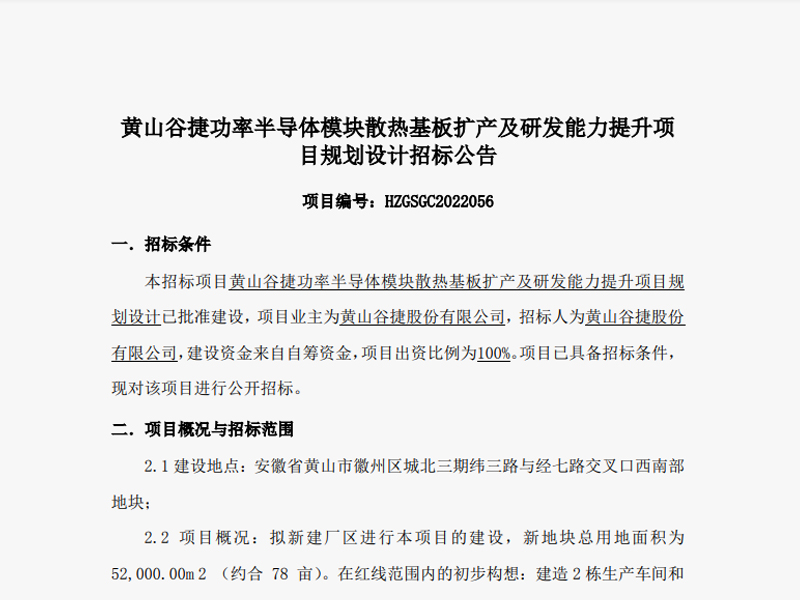 Mount Huangshan Gujie Power Semiconductor Module Heat Dissipation Base Plate Production Expansion and R&D Capacity Improvement Project Planning and Design Bidding Announcement -11.11